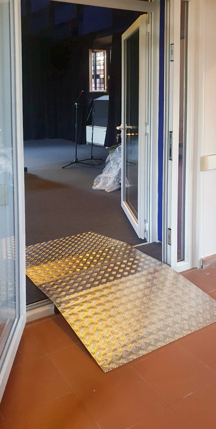 Allestimento-trattamento acustico fonoassorbente con porte fonoimpedenti per una grande sala di ripresa (tendaggio perimetrale in tessuto di velluto nero